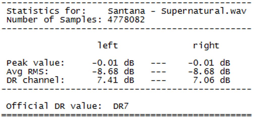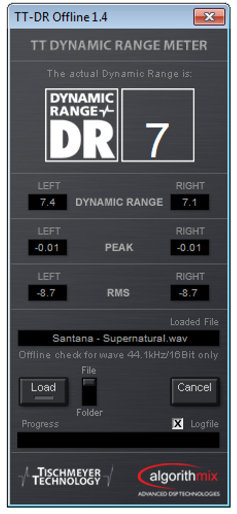 We’ve written about compression and the loudness war for years (see: Current Trend in the Recording Format Arena and CD Compression Depression for two examples), and we’re not alone in our frustration. The Pleasurize Music Foundation created TT Dynamic Range Meter with the goal of fighting the over-compression of music. The program tells you the dynamic range of songs, so you can find out if you have just purchased a quality recording or not. One fun use of DR Meter is to compare different releases of the same song or album. The program is incredibly easy to use, simply select the track or folder you want analyzed ... and that’s it. It takes a few seconds for the program to spit out a number telling you the dynamic range of the album or track. It can also create a log file telling you the dynamic range of each individual track if you scan an entire folder. According to their website, a DR of 7 “is low for rock music or very low for Jazz, [but] it is quite acceptable for electronic club music which has nowadays often values below DR4. All values above DR12 have generally a high dynamic quality.”