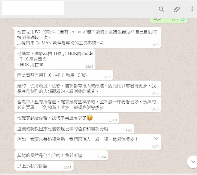 第二天分別收到蘇先生和新成田曦哥的Whatsapp對調出來的畫面十分滿意,用家的讚賞就是令小編對畫面調校執著的動力。