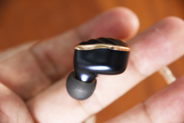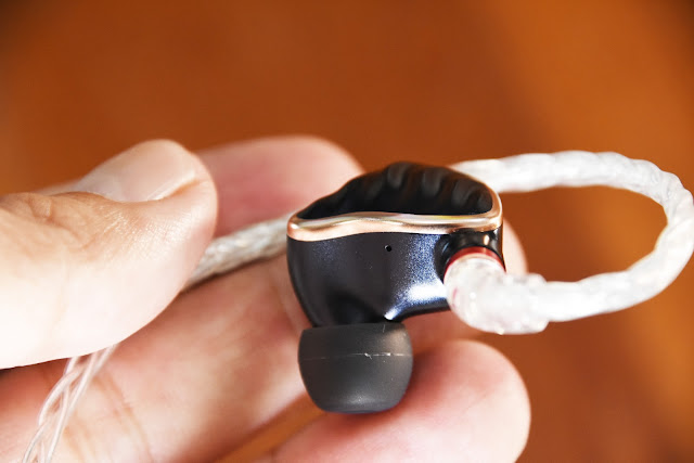 1.在外觀上 : FiiO FH7 外觀上,可以發現和 FiiO 以往耳機很不同,他是金屬(鋁鎂合金)的外殼,摸起來真的很有份量和質感,加上金邊和黑色本體的烤漆,看起來真的就是精品。同時水波紋造型設計讓 FH7 看起來外型有更多變化,算是不錯的設計。另外值得一提的是,他這次外型是符合人耳的輪廓,加上繞耳型線的配戴方法,所以配戴起來很貼耳,也很舒適,這算是加分的一點。