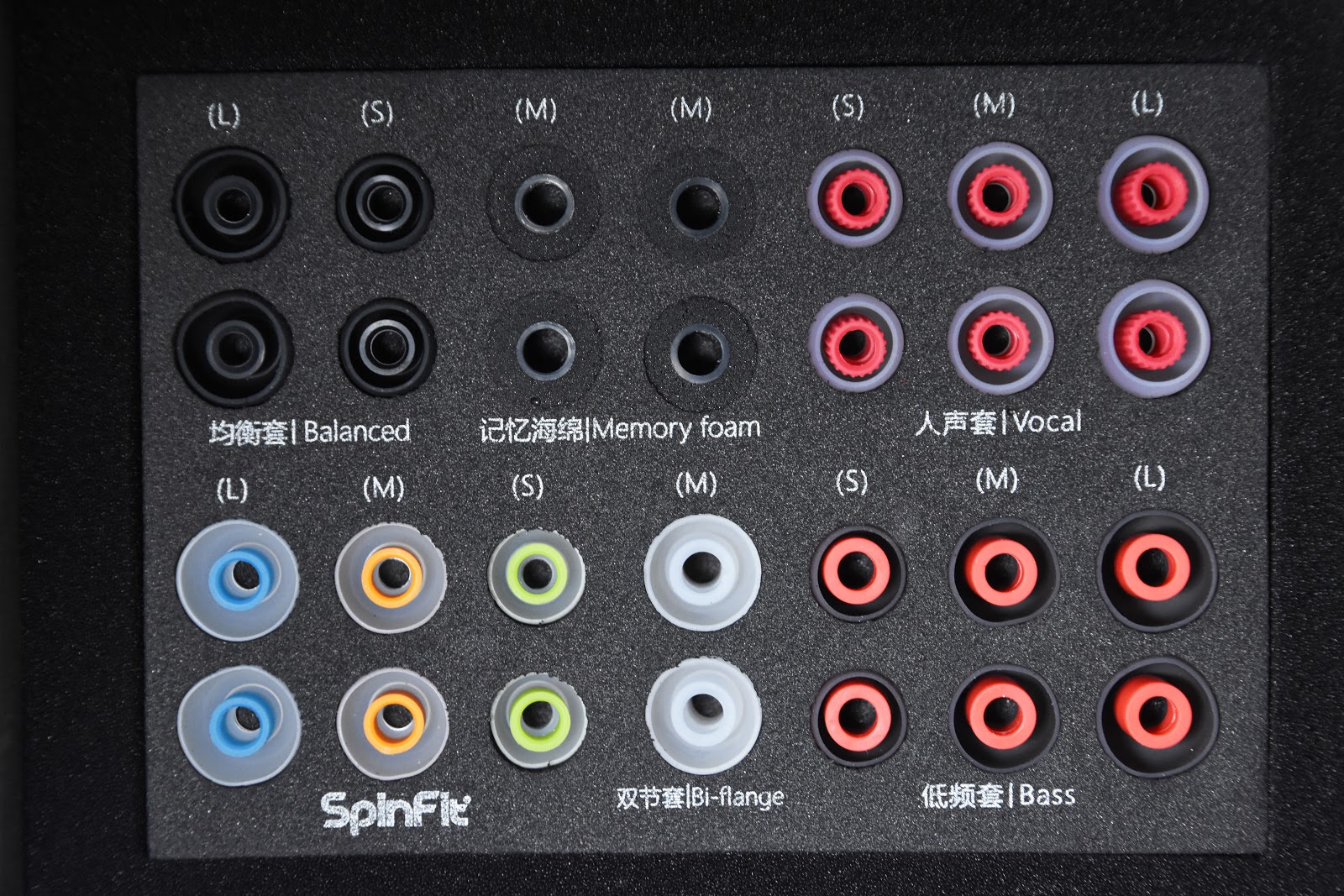 ▼ FiiO FH7 附的各式耳塞,發現是依聲音特性來做分類,分成標準的均衡套耳塞( M Size 已套在耳機上)、人聲套耳塞、記憶海綿套耳塞、SpinFit 雙節耳塞、一般雙節套耳塞、低頻套耳塞。當然各種形式耳塞也有大中小,我相信可以適合各種耳型的人,也可以滿足對不同類型聲音的有所要求的人。