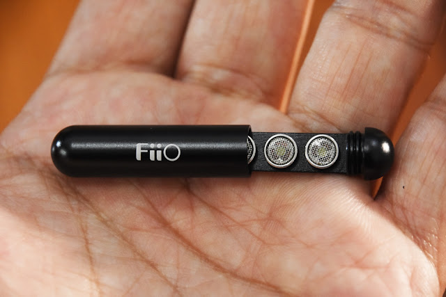 ▼ FiiO FH7 的「聲音濾波器」放置金屬膠囊,拿在手上的樣子。