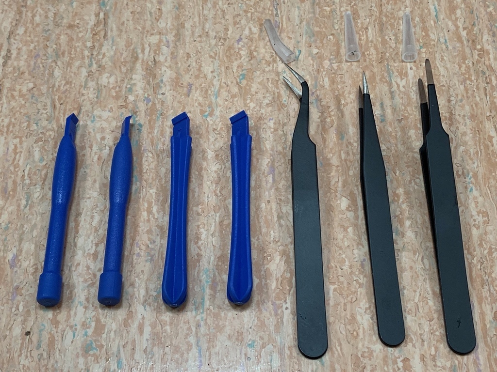 塑膠翹棒 (Plastic Spudger),最右側黑色那支,防靜電,尼龍製成的小工具,韌性強,不傷金屬機身,平端可以分離連結端子,移除散熱膏,撬開組件,協助焊接等等。凹口可以鉤住電線。尖端可用於連接或斷開組件。