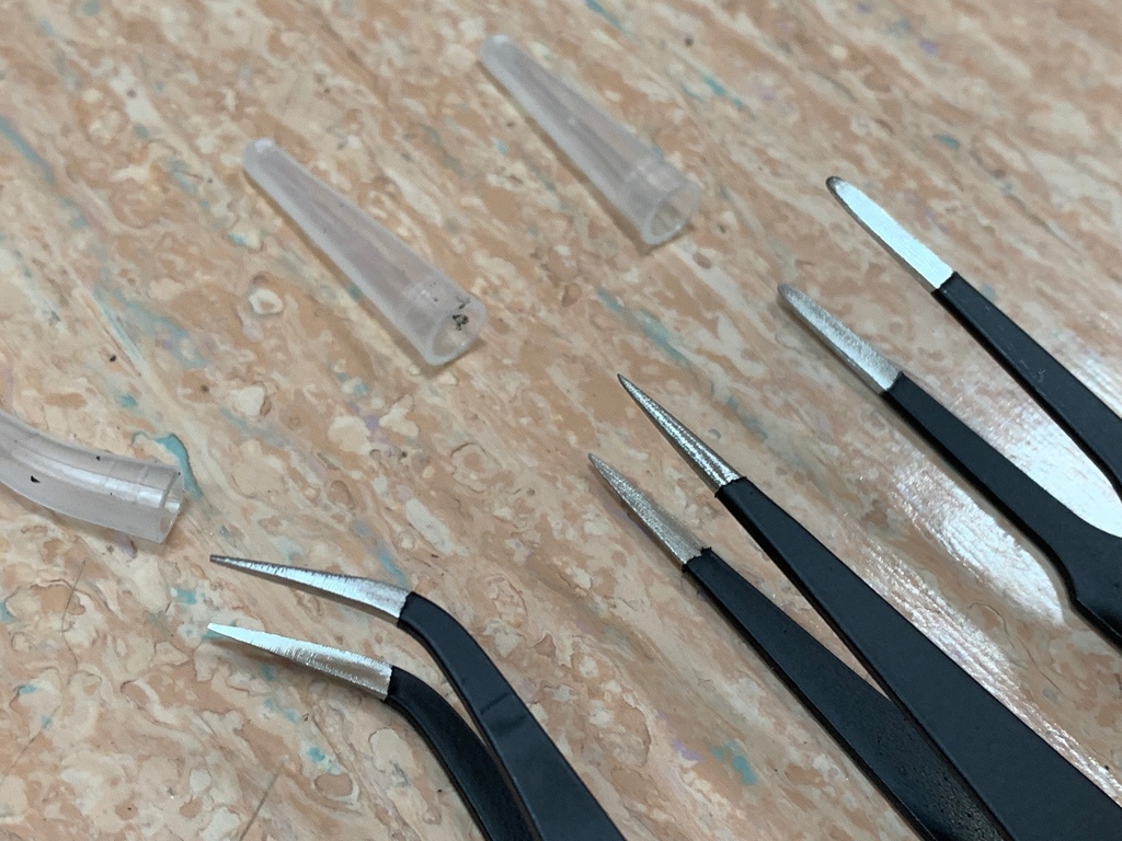 三支鑷子 ( ESD Safe Tweezers ), 防靜電放電的精密小鑷子,可夾取細微的物件,例如電容器、小螺絲、金屬墊片等等。有個小缺點是尖端的內側沒有防滑刻紋。