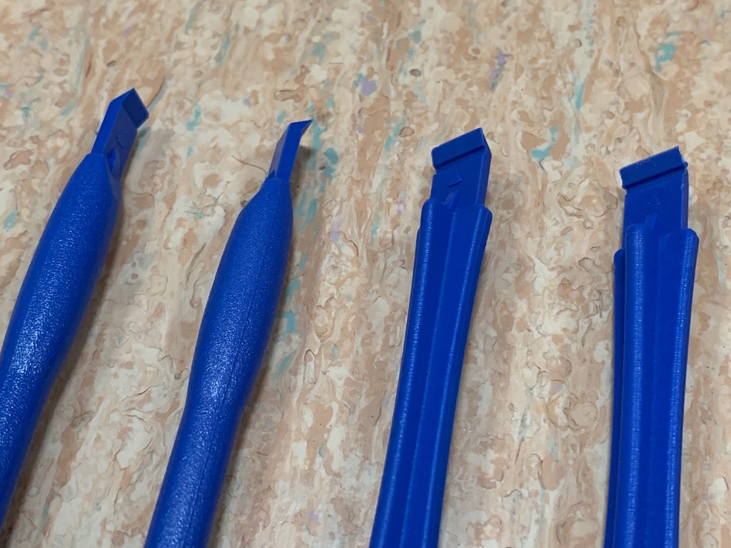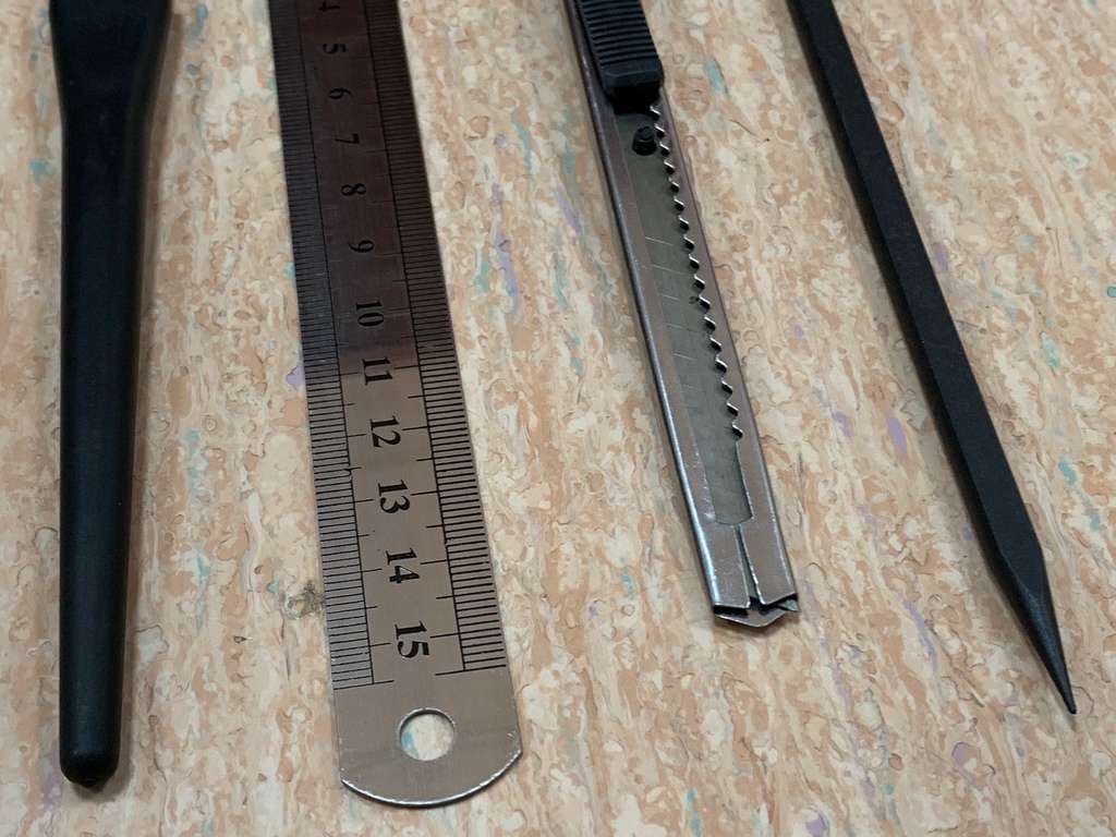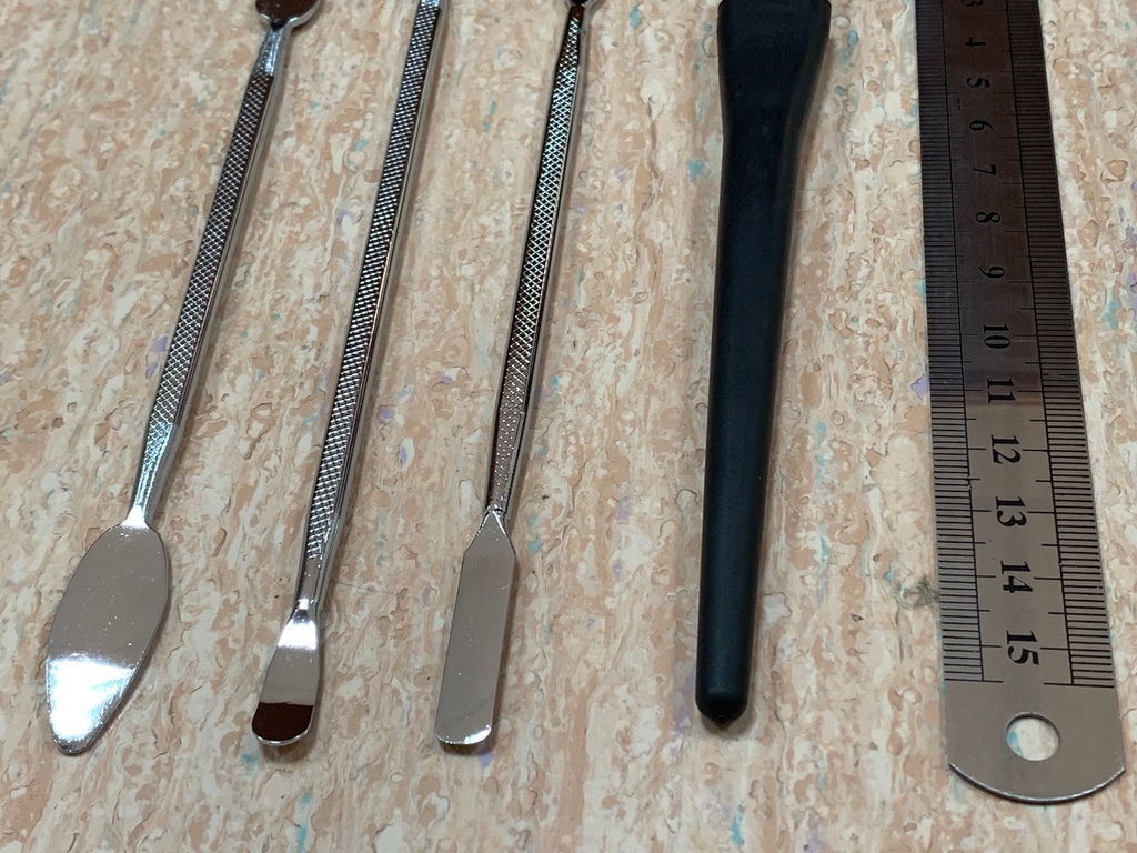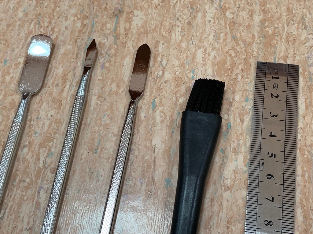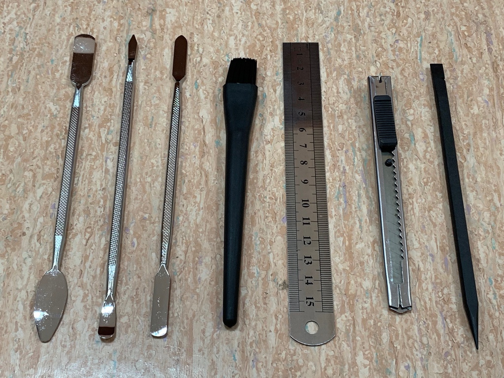 三支金屬翹棒 (Metal spudger),長的有點像刮刀,手柄處有刻紋,長度剛剛好,利用槓桿作用可分離組件,尤其是對付有上膠或卡榫的組件。頭端不同大小與形狀適合不同的場合。