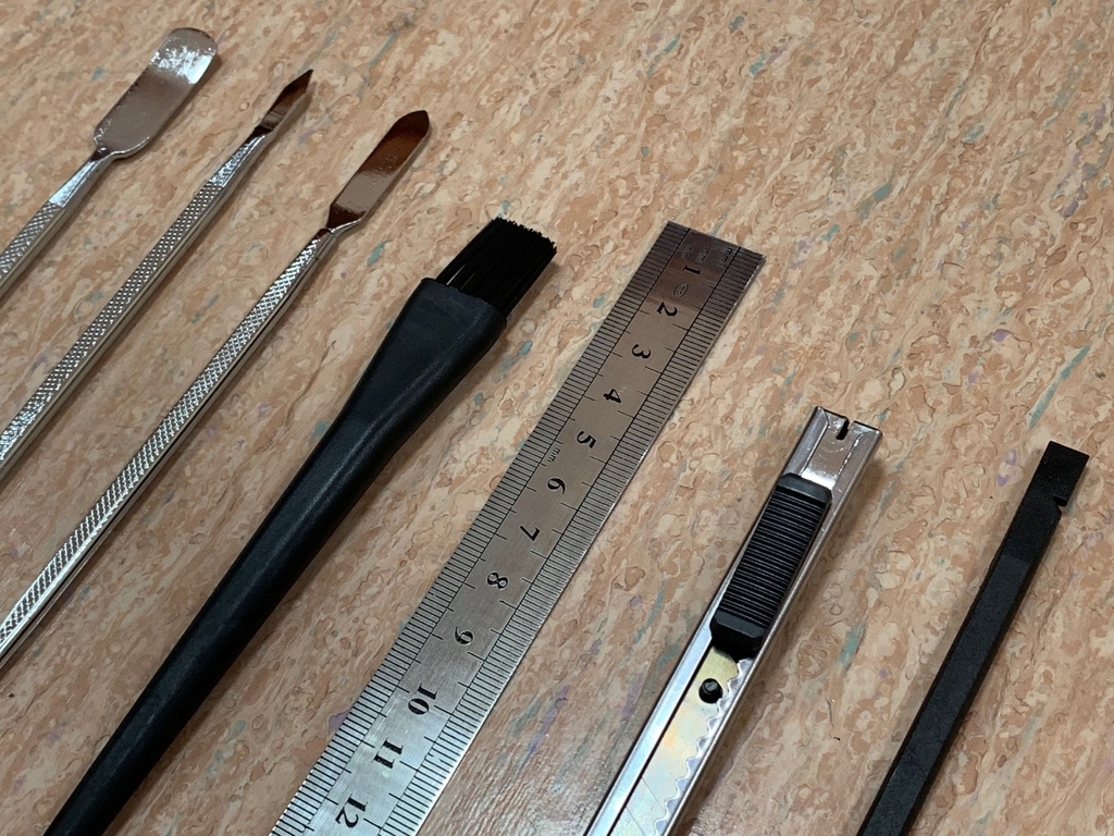 右側為金屬翹棒三支, 防靜電刷、 六吋金屬尺、萬用小刀、 塑膠翹棒