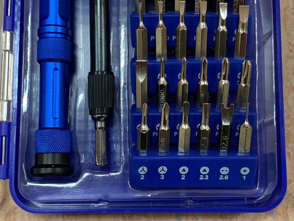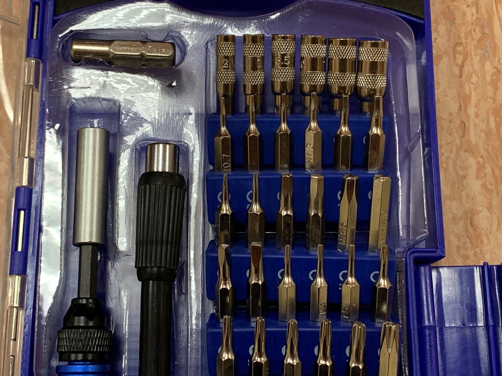 再來是中間的 螺絲起子工具組 (Screwdriver kit (56 bits)),各式各樣的螺絲頭,共有 56 種,幾乎囊括所有小型 3C 產品的螺絲形式。