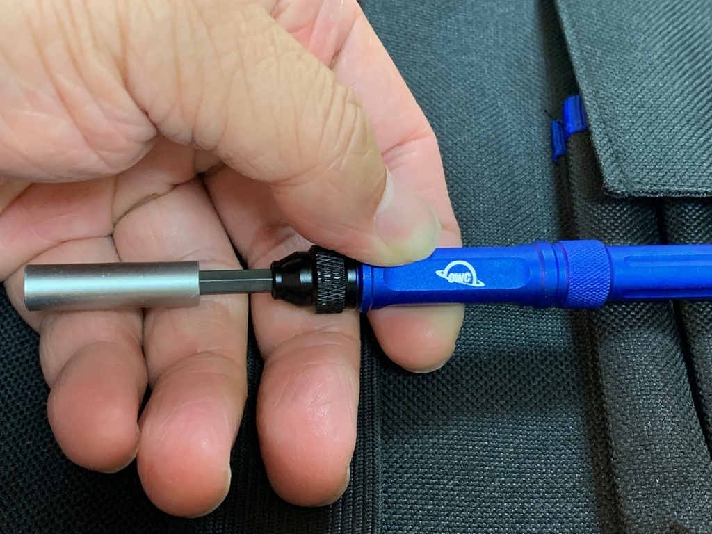 起子的握把有 OWC 的 Logo,握把的刻紋可以增加摩擦力,具有磁性使轉接頭不易掉落,亦可吸起螺絲。