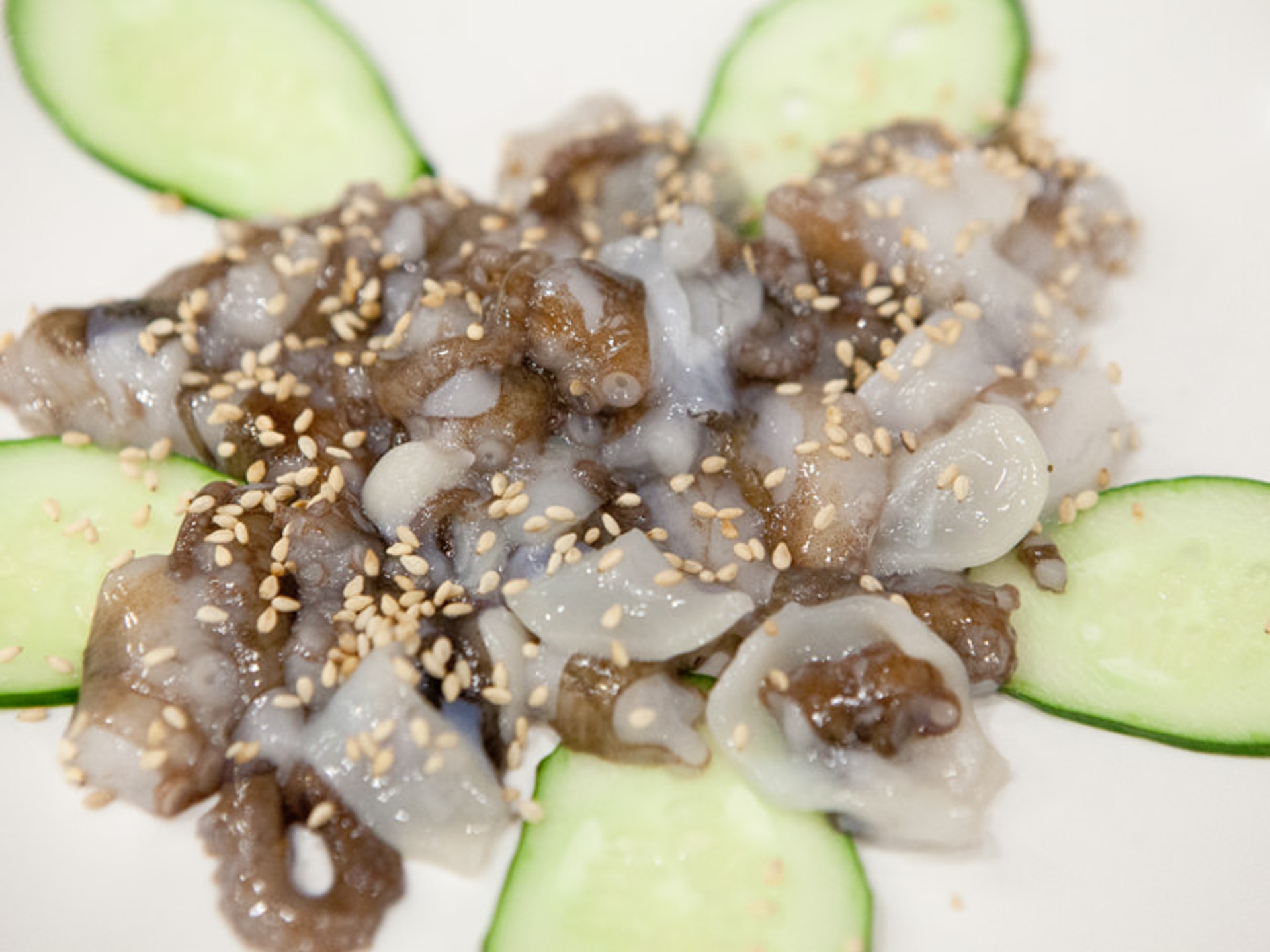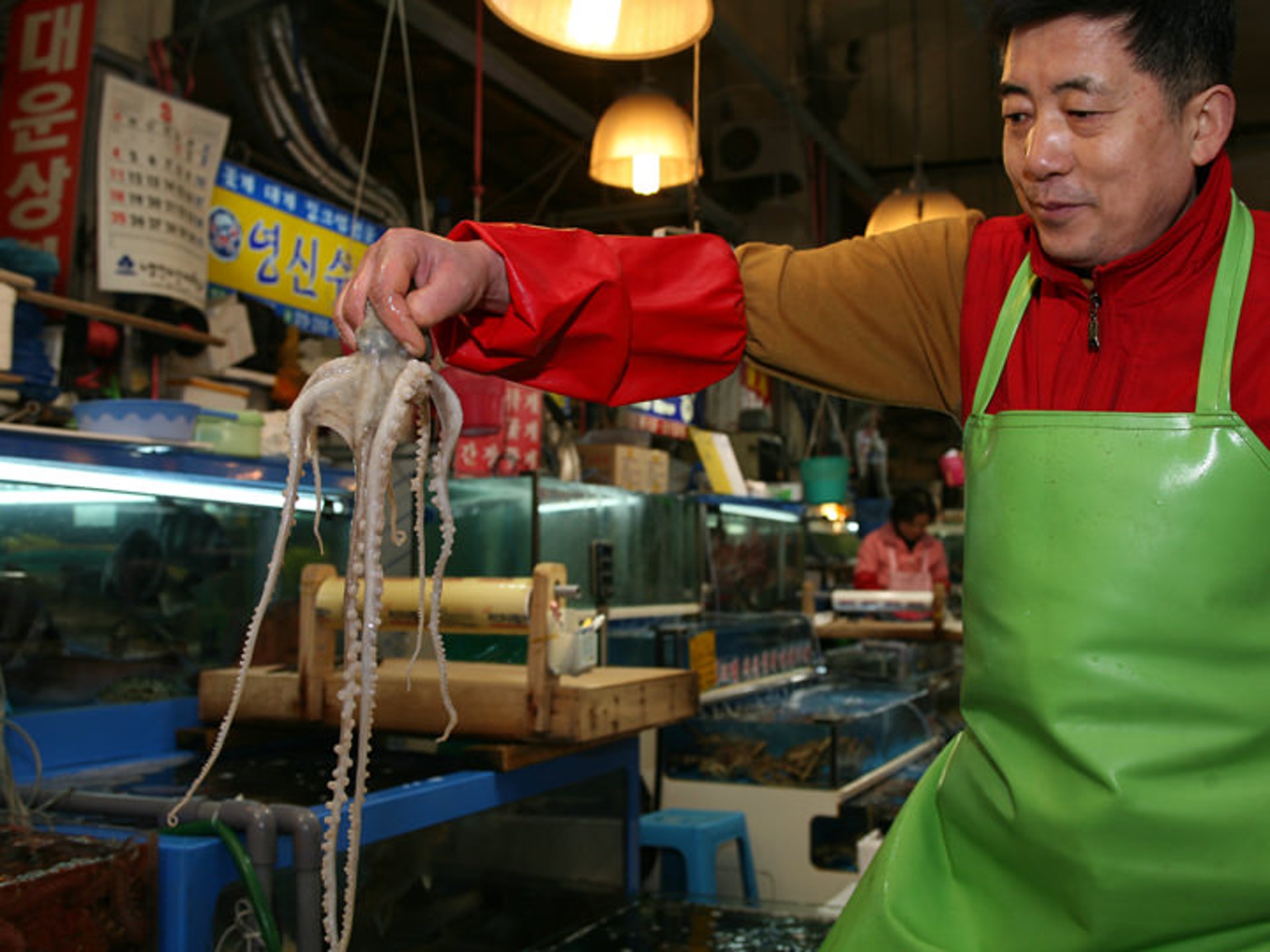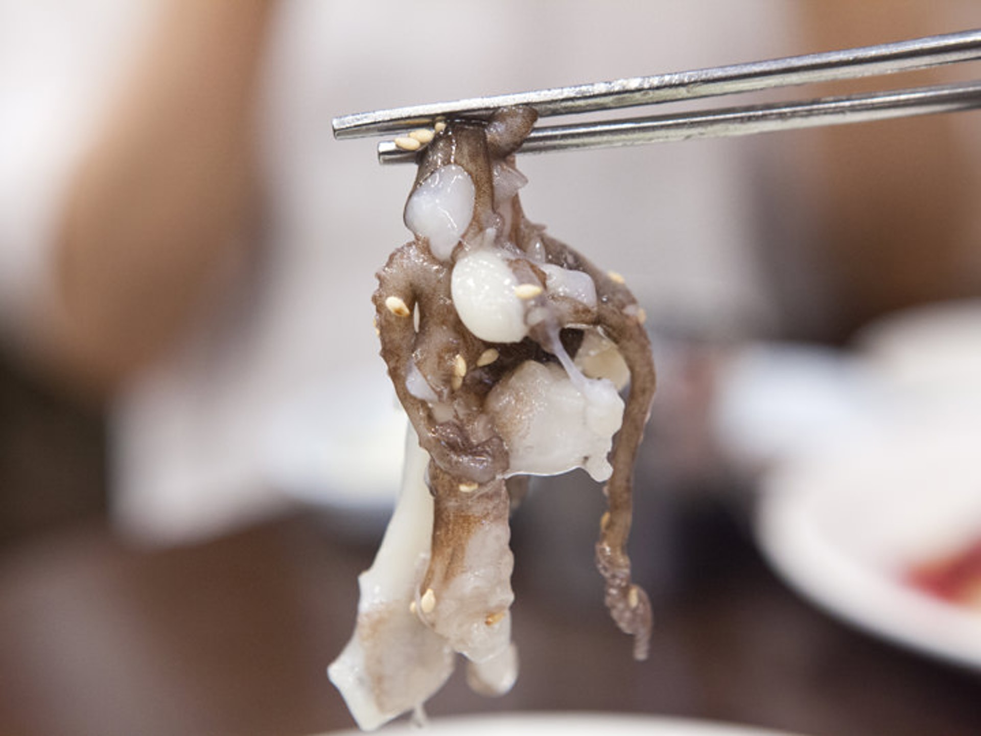 1. 生章魚 看過電影《原罪犯》的朋友,肯定對片中大叔將蠕動的生章魚往嘴裡塞著吃的一幕印象深刻,這個場景也許令不少觀影者當時就覺得噁心,但是在韓國人看來,這其實是再正常不過的了,因為生章魚嫩滑爽口,是韓國人當魚生片概念一樣經常吃的一道料理而已。可以在一些海鮮飯店裡點這道菜,也可以在諸如鷺梁津水產市場這樣的地方買了鮮活的章魚後拿到旁邊餐館裡讓店家給你做。一般的做法是將其與芝麻油鹽、蒜末等一起拌,吃起來其實還挺香的。就是看到滿盤子蠕動的章魚身軀,然後夾在筷子上還能感受到它們在奮力扭動的力氣,會覺得很殘忍。選擇吃與不吃,由你做主。