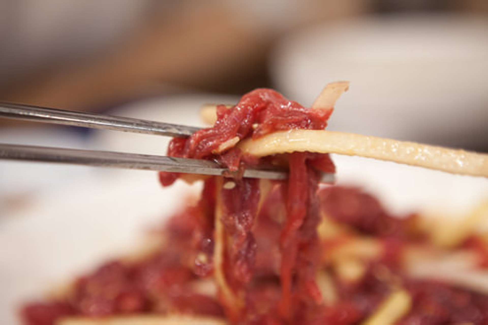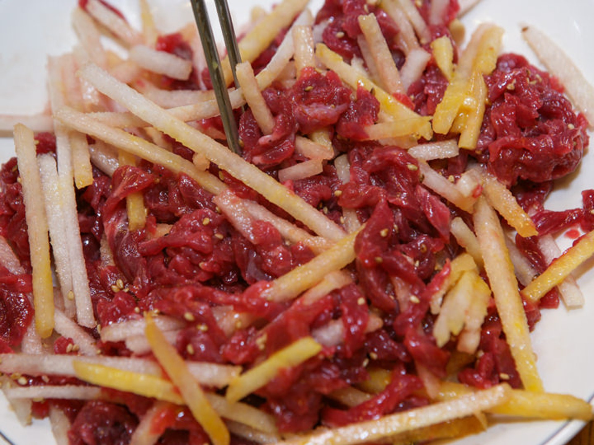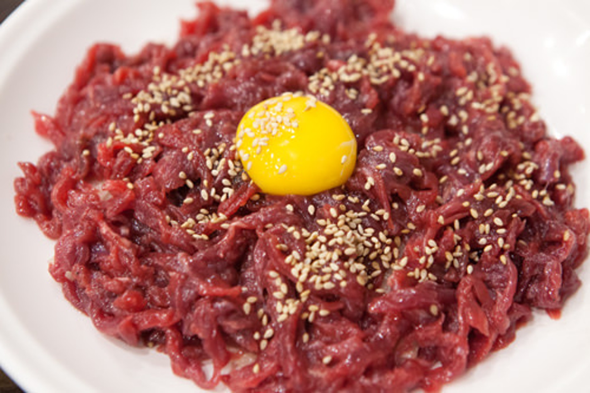 2. 生拌牛肉 你可能完全可以接受5分熟的牛扒,可是你能接受百分百全生的牛肉麼?生拌牛肉就是這麼一道全生的牛肉料理。因為是生吃,所以這道菜對牛肉的要求很高,必須是特別新鮮的牛肉, 而且多取自牛腰到牛臀的大塊瘦肉,切成絲狀與芝麻、香油、梨絲、生蛋黃一起拌,吃起來其實沒有肉腥味,而且肉質柔軟嫩滑又濕潤,口感很不錯!在韓國,生拌牛肉深受人們特別是大叔們的歡迎,經常被用來作為下酒菜,當然也常被搭配拌飯做成生拌牛肉拌飯。值得一試!