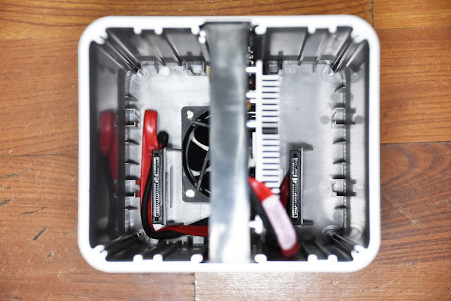 ▼ 從這一邊看詮力科技 ITE2 NAS NE-201  內部,可以看到系統主機板和主機板上大大的散熱片,我想這樣的散熱片配合系統風散是足以幫 Intel Celeron 3955U 雙核 2.00 GHz 的 CPU 做散熱的,我使用到現在快一個月了,執行過許多程式和看過許多影片(包含 4K),NE-201 也沒有出現任何過熱狀態。