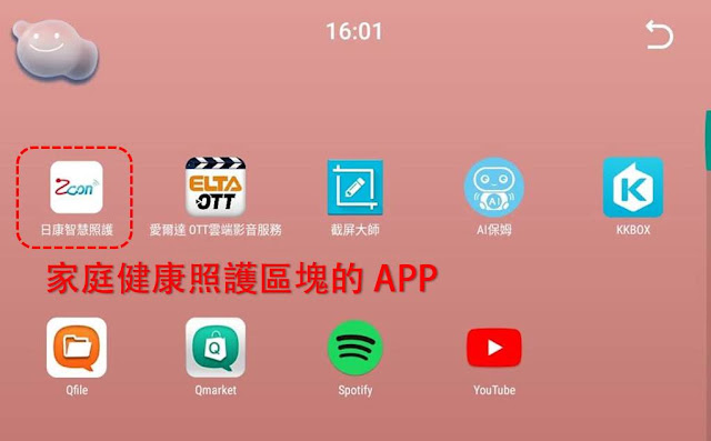 ▼ 「應用程式」裡面有基本的日康智慧照護(需有照護套件)、YouTube、KKBO 免費試用一個月) 和 Qmarket.(可利用這APP去下載QNAP自製的APP),其他的 APP 則需要自行安裝。