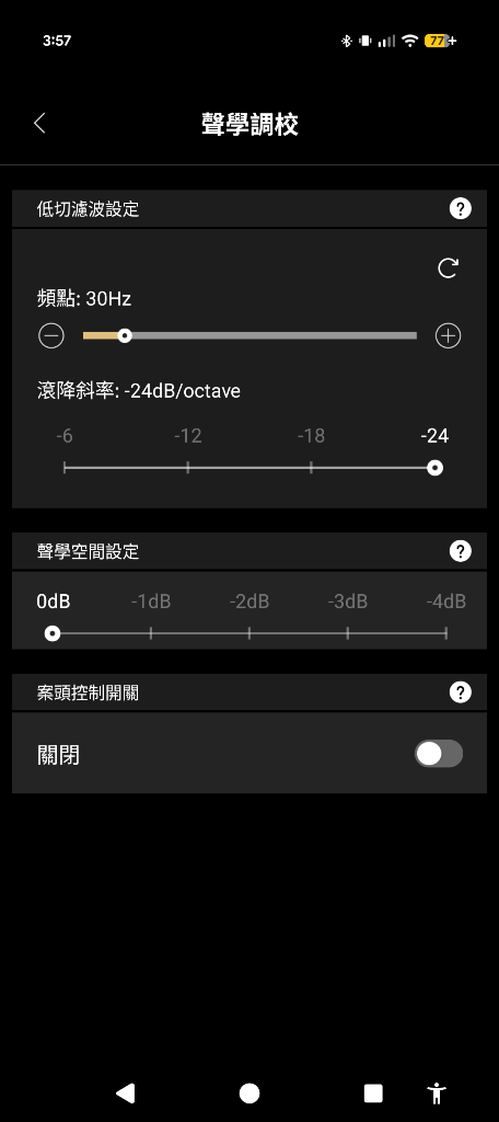 ▼聲學調校可以設定低頻率波與聲學空間設定