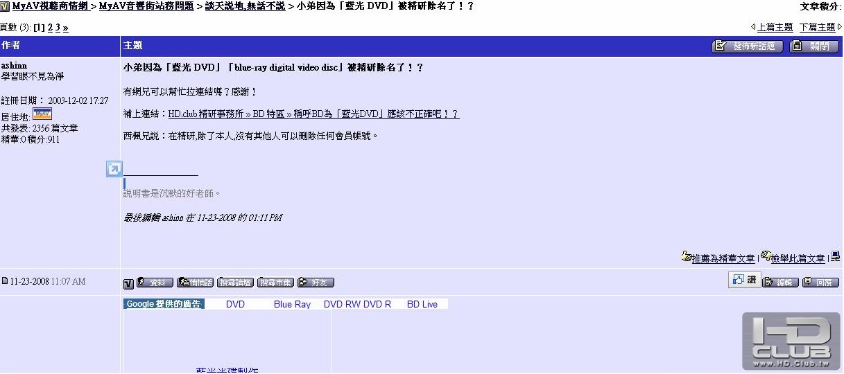 如果沒記錯當初三劍客被除名的原因是與論壇大老們爭辯”藍光DVD”一辭是否正確,如果現在三人是座上賓?那是不是代表精研認同該名詞?還是事情過了都可以不算?帳號被刪了重新找人來搓個湯圓一切就可以當做沒發生過?別再刪我的文或封鎖。再刪再封表示你們自已也默認。