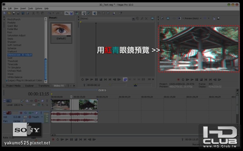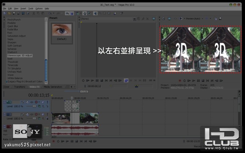 4. 剪輯時可利用 Video FX 選單中的 Stereoscopic 3D Adjust 來對正負視差等參數做微調