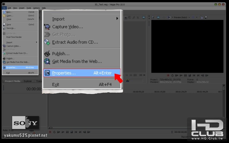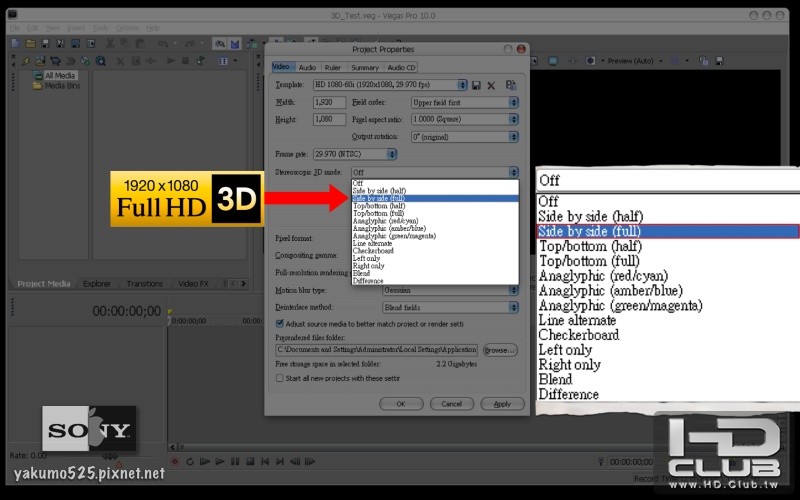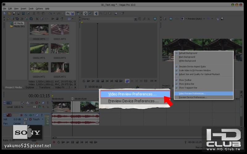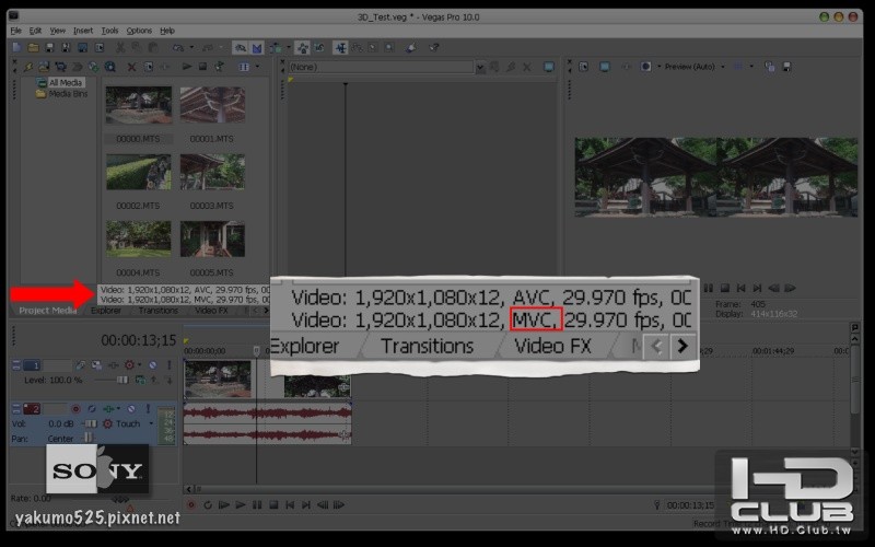 以最新版的 Vegas Pro 10.0e 來說,已完整支援 HDR-TD10 跟專業版的 HXR-NX3D1 所拍攝的 MVC 影片。以下便針對 3D 素材匯入後,從剪輯設定到作品發行的工作流程做簡易的介紹: