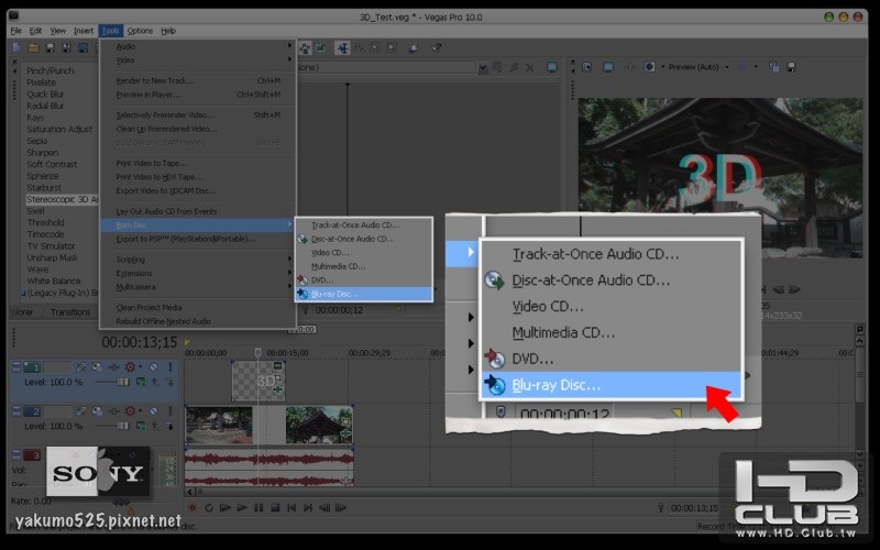 5. 作品完成後,透過 Tools 選單裡的 Burn Disc 來製作 Blu-ray 3D 光碟