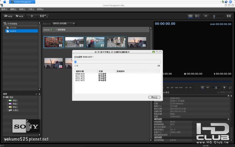 至於尚未支援 MVC 影片的非線性剪輯軟體而言,可以透過像是 neo 3D 等外掛套件來剪輯左右分離的 3D 影片,這時就會需要先把單一的 MVC 檔案分離成左右眼兩個檔案。關於轉換的工具,如果是 Sony HXR-NX3D1 的使用者,透過隨附光碟裡最新版的 Content Management Utility 2.1 管理軟體,便可將從攝影機匯入的 MVC 檔案進行 L/R 分離的動作,且分離的檔案編碼格式仍然維持原有的 AVCHD 編碼,所以轉換速度還算不慢。