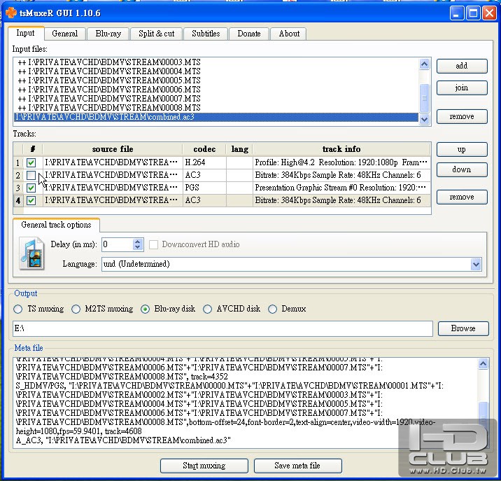 2. 用 tsmuxer add 第一個要合併的片段 (00000.mts)