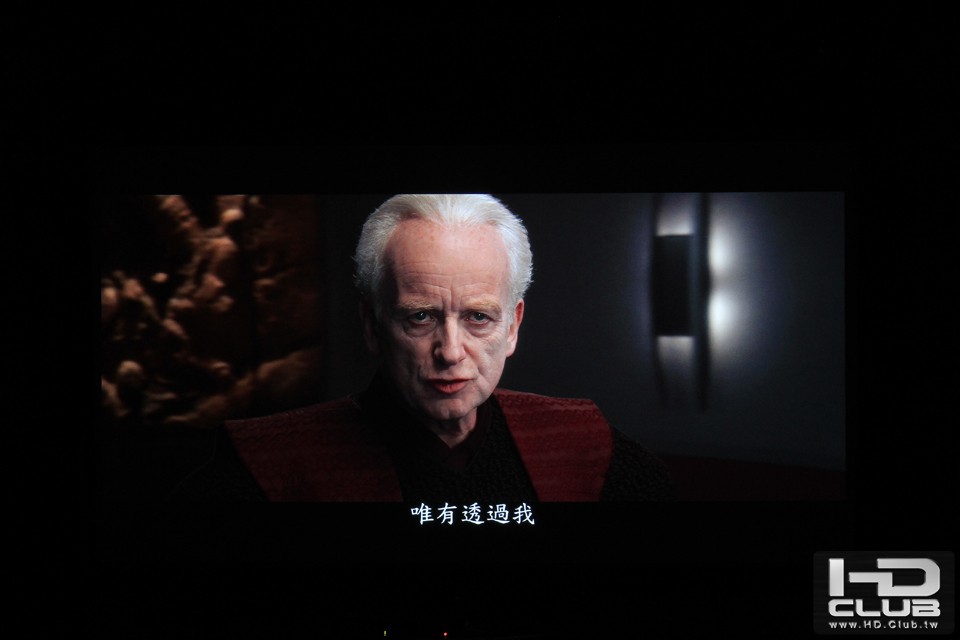 接著開始欣賞W1200播放1080p/24藍光電影的表現,單板式DLP在銳利度的表現向來是優於泛液晶系統的投影機,本機在這點的表現上更是可圈可點,接上PC,畫面的中心點、四周邊緣均維持一樣的水準,貼近銀幕細看,肉眼是查覺不到任何字體滲色、邊緣模糊的狀況,這樣的優勢在觀看動畫片感受最深,功夫熊貓2片中主角阿波,毛髮細膩的程度非常能張顯出FullHD的價值,星戰3裡白普庭議長 (達斯西帝) 臉上蒼老的皺紋也刻劃的相當細緻。不過在這裡小弟要提醒一下用家,本機銳利度預設值過於銳化,必需大幅調降方能得到最佳狀態,否則很難有個人上述所表達的感受。