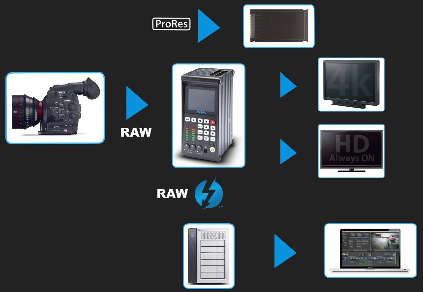 –RAW signal is passed from camera to Ki Pro Quad and out via Thunderbolt to computer/storage