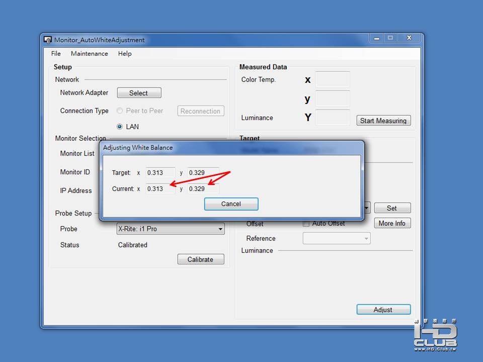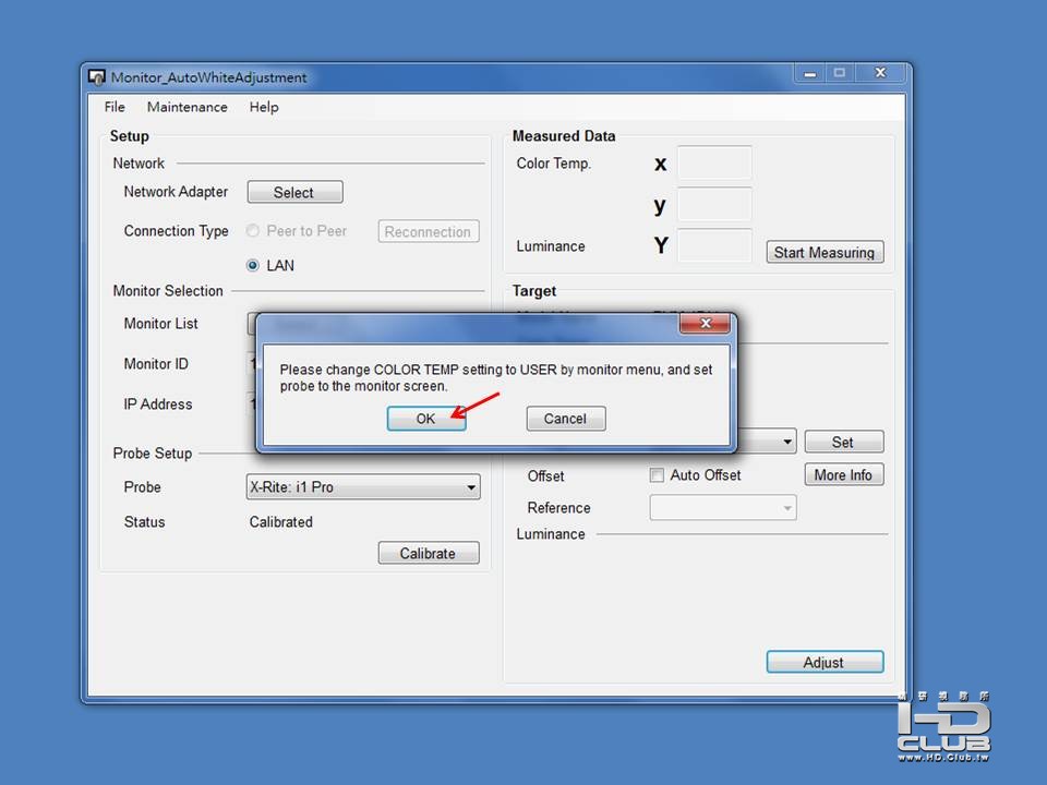 接著按下右下角落的Adjust鈕. 就開始了. 螢幕會跳出一個小視窗. 提醒你. 校正會使用user的Color Temp選項. 調整完就不要再改回原來的D65或D91設定了.