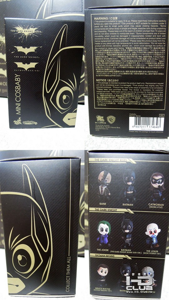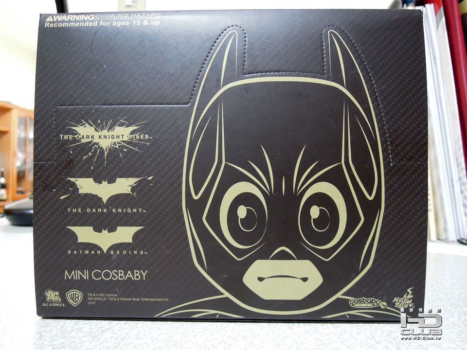 大盒上正面有大大的蝙蝠俠Cosbaby圖像以及諾蘭蝙蝠俠三部曲片名及蝙蝠LOGO