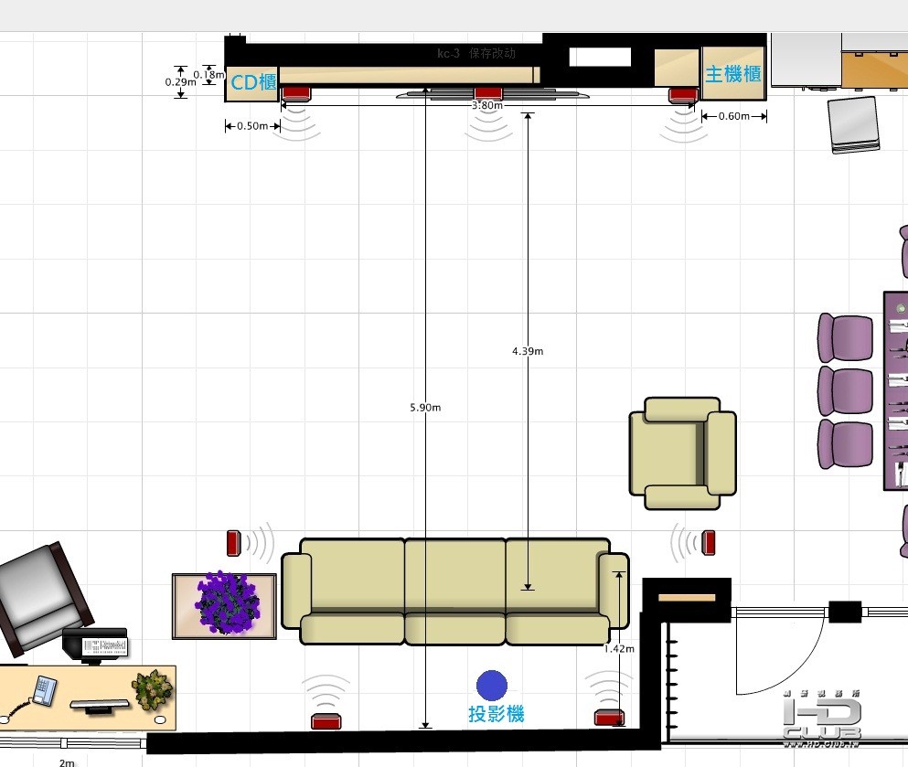 以目前您的擺位,若前方電視櫃整體無法左移,那不知是否在主聆聽位置(沙發)的部分可以移動? 因目前您的擺位看起來較嚴重的右後環的部分,若能把此處以擺位方式解決,對環場,相位等等會有非常大的提升。