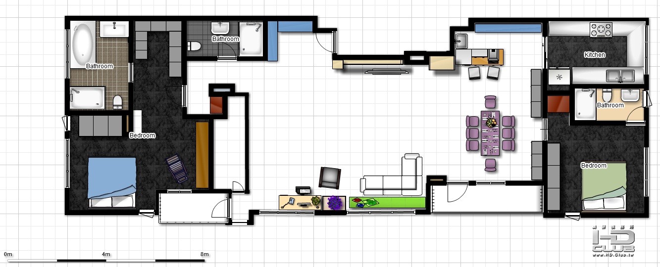 建議方式為三人沙發往前1~1.5m 或沙發背剛好與左側L型牆面切齊。 並將左右後環繞喇叭往前移動1~1.5m, 此時右後環就能閃避牆面干擾,兩個後環便建議使用腳架。另將單人沙發擺到左側,以防止阻擋左側餐廳動線。後方多出的空間,建議使用書櫃或cd櫃,有些餘的擴散作用。