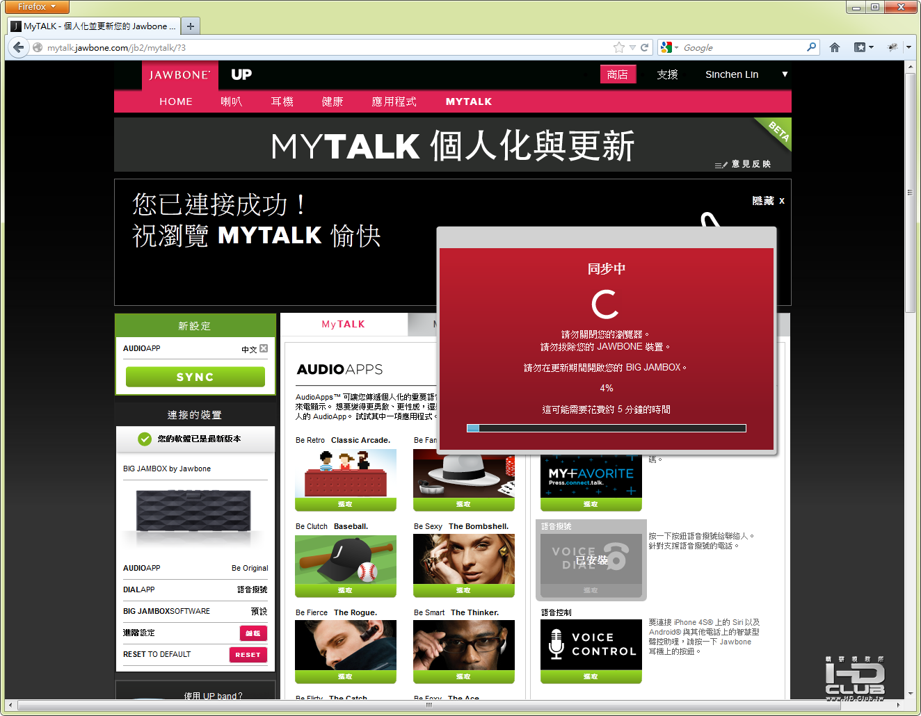 使用者可以透過Jawbone MYTALK的網站來更新或者調整BIGJAMBOX,像是語音回饋的AudioApp,就有推出非常多的聲音,像是SEXY女聲、Smart磁性聰明男生等,這些多變的聲音都能直接從MYTALK 網站更新,非常的好玩有趣,筆者比較喜歡Be Retro. Classic Arcade. 的聲音,開機的時候同事都以為我在玩以前8 Bit的電動。