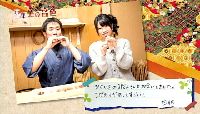 今回、横山が触れる音は、平安京の趣きをいまに残す雅な音色、雅楽。平安時代の宮廷社会で愛でられた雅楽の癒しの音に触れ、そして自ら演奏することで1000年続く音色に思いを馳せる。宮廷装束の十二単に実際に身を包んだ横山。身も心もタイムスリップして、雅の音色を体感する。