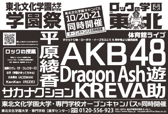 しかし、4回目の実施を間近に控えた昨年3月、東日本大震災の影響を受けてやむなく中止に。今回は、「ロックで東北を元気に!」という主旨のもと、宮城県仙台市にある東北文化学園大学で2年7か月ぶりに開校しました。実施会場のキャンパスには、10月20日(土)、21日(日)の2日間におよそ2万人の来場者が訪れました。これまで以上に大きな盛り上がりを見せた今回の「ロックの学園」の模様を、3週にわたってたっぷりお届けします。