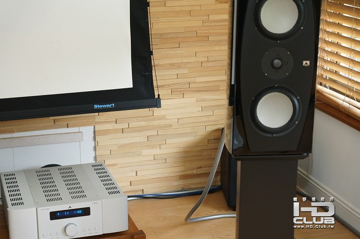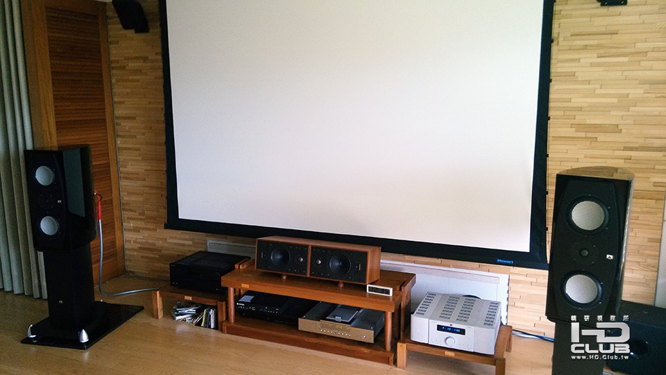 器材櫃由左至右 : ONKYO環繞擴大機 / Pioneer藍光播放機 / 中華電信MOD / Bluemaster CD PLAYER / XTZ綜擴 (業主同100.33同時入手) , 照片裡的布幕是Stewart 4:3電動張力幕已經是十多年前裝設的