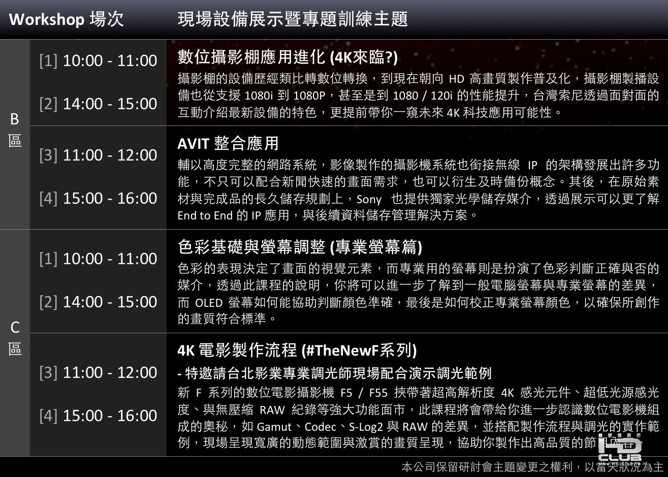 | 研討會議程表 | | | 13:00 - 14:00 | 開放現場展示 | | 14:00 - 14:05 | 導言 | | 14:05 - 14:25 | Sony 觀點 : Beyond Definition | | 14:25 - 14:45 | Sony 2013 新產品發表 | | 14:45 - 15:05 | 茶點時間 | | 15:05 - 15:30 | 4K / S35 大片幅製作 - 海外篇 | | 15:30 - 15:40 | Sony 格式新成員 - XAVC | | 15:40 - 16:00 | 再造顛峰 -- 台灣索尼專業系統方案