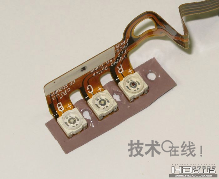 打開“PK101”的外殼後取出光學模組。在拆解光學模組之前,首先拆下安裝在模組周圍的銅板(圖1)。拆卸銅板的同時,拆下連著銅板的紅綠藍(RGB)LED光源。安裝光源的柔性底板上刻有台灣揚明光學(Young Optics)的標誌(圖2)。雖然不清楚LED的生產廠商,但估計“可能是台灣廠商製造”(日本某LED廠商的行銷主管)。