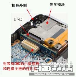 DMD封裝在小型底板上,該小型底板和主板由連接器立體連接(圖5)。用DMD作顯示元件的投影機多採用柔性底板連接主板和DMD。此次只使用連接器進行連接,推測是為了簡化結構。