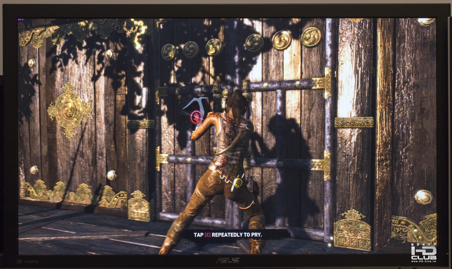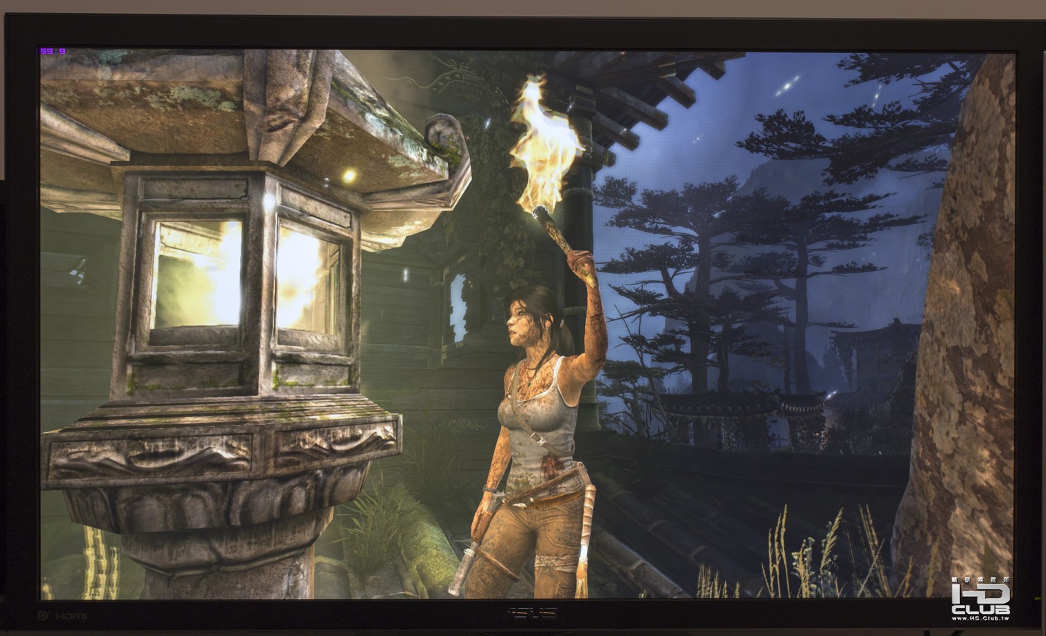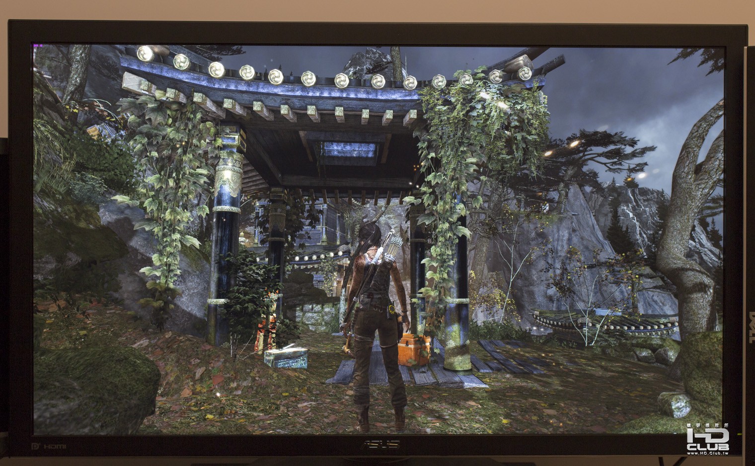 如果只測幾年前的遊戲,實在太委屈PQ321Q,所以又借了比GTX 680 SLI還要略強的GTX 690測試近期的遊戲在PQ321Q上的表現。首先是古墓奇兵 (Tomb Raider,2013),在4K的解析度下畫質非常細緻,光影表現相當真實。不過全體的畫質設定只能開到第二高的ULTRA ,調到最高的ULTIMATE 就變成幻燈片。