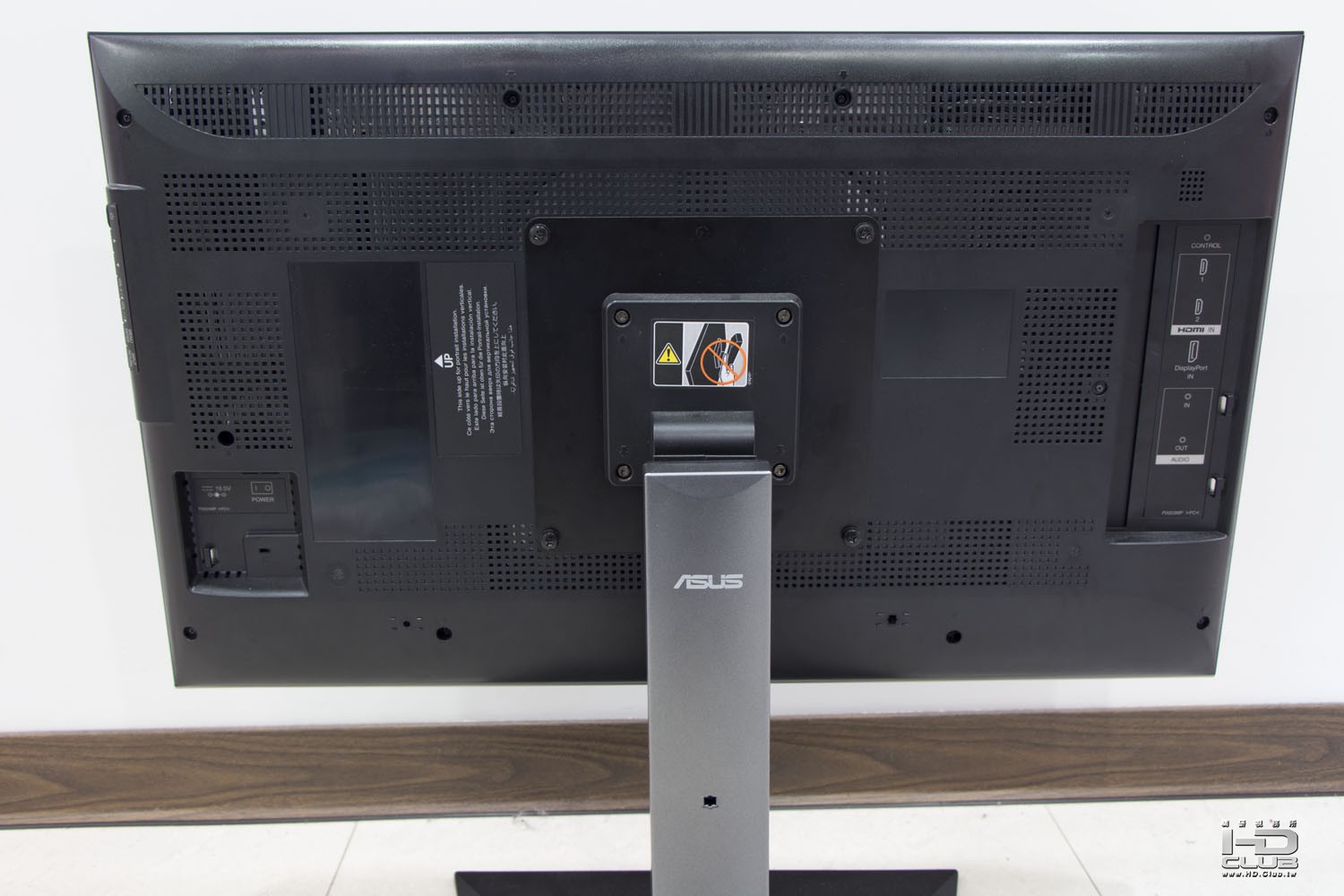 PQ321的上下升降範圍為15CM(不好意思,鏡頭的關係讓螢幕變形有點嚴重),為了將本體的厚度壓在3.5cm,變壓器是外接的,消耗電力是這個尺寸來說不算高的93W,實際使用時也不會覺得溫度偏高。