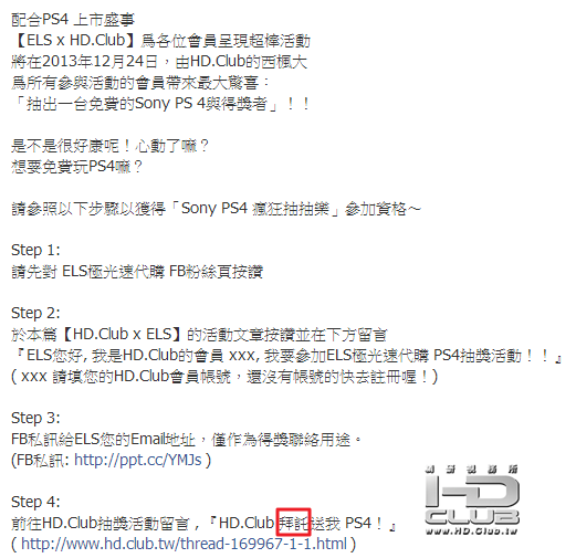west 發表於 2013-11-23 01:05 還拜託勒!!! 剛剛補充了一點 Step 3:FB私訊給ELS您的Email地址,僅作為得獎聯絡用途