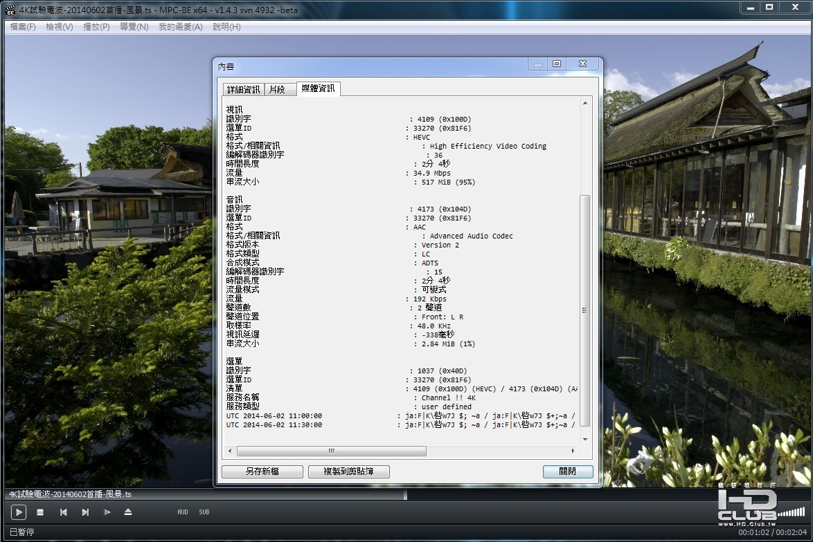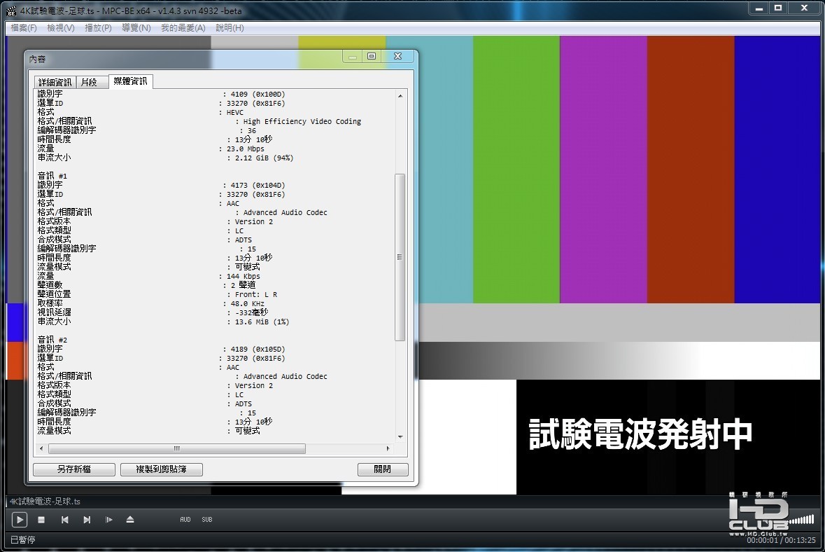 使用PC電腦播放,請先下載更新可以對應HEVC解碼的播放軟體 MPC-BE.1.4.3.4942.x64-installer.(VS2013)