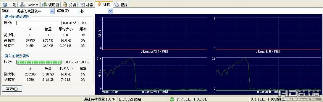 你這時看UTORRENT下面速度裡的硬碟寫入快取的格線條就沒有了