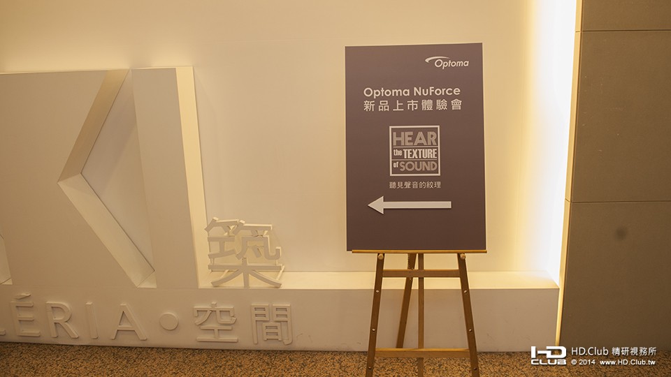 這次的產品發表會假台北市重慶南路一段2號B1的築空間B廳舉行。往地下室走一入場就看到偌大的產品發表會招牌。這次的Optoma NuForce新品上市體驗會的主題是:Hear the Texture of Sound--聽見聲音的紋理。主題當然與過往的影像不同,是以聲音為主要訴求。
