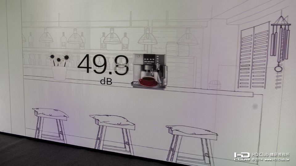 在正式發表會之前Optoma奧圖碼特別規劃了針對媒體朋友們的影音體驗區,在築空間裡隔了一條長廊,上部架設了5部Optoma奧圖碼的投影機,以觸控互動式的方式讓各位與會的朋友體驗Optoma奧圖碼對聲音的想法以及著墨。在這一段互動體驗中只要手去碰觸投影布幕上的物件,比方說圖中的咖啡機,便會快速發出咖啡壺煮沸的聲音,以高還原度的方式呈現真實物件的聲音。