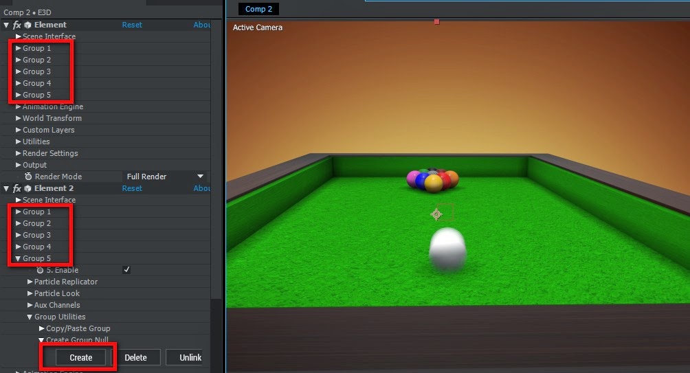 一個Group放一顆球的原因,是因為需要提取它的Create Group Null,這個小東西會自動連結Group裡面的物件,所以操作Group Null的位置屬性,就可以控制撞球的位置轉動等等。