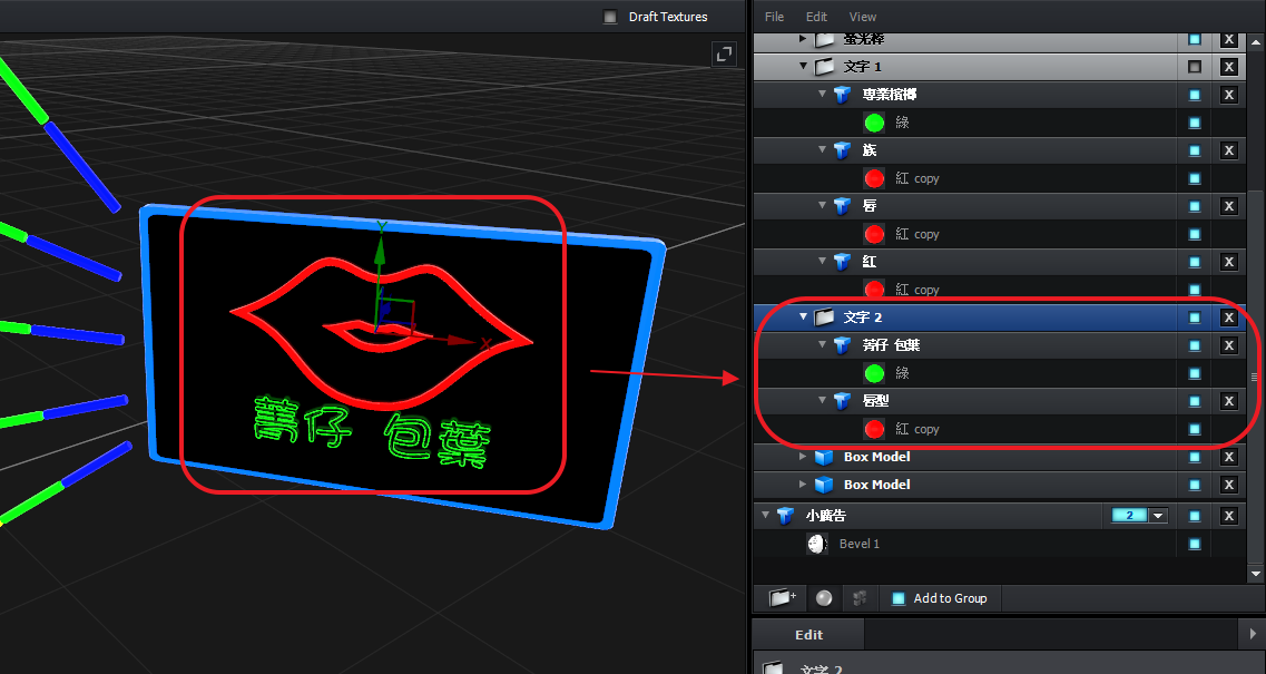 剛剛將文字跟圖形都建立在同一個Group的資料夾內,所以可以同時看到兩個模型