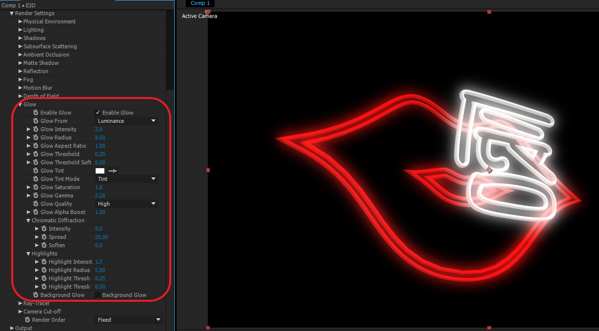 我比較偏好選用Illumination,這樣可以分開調整不同材質球的Intensity,控制個別效果。 這邊可以發現,調整參數在E3D的場景中看不到發光效果,必須回到AE才看得到。