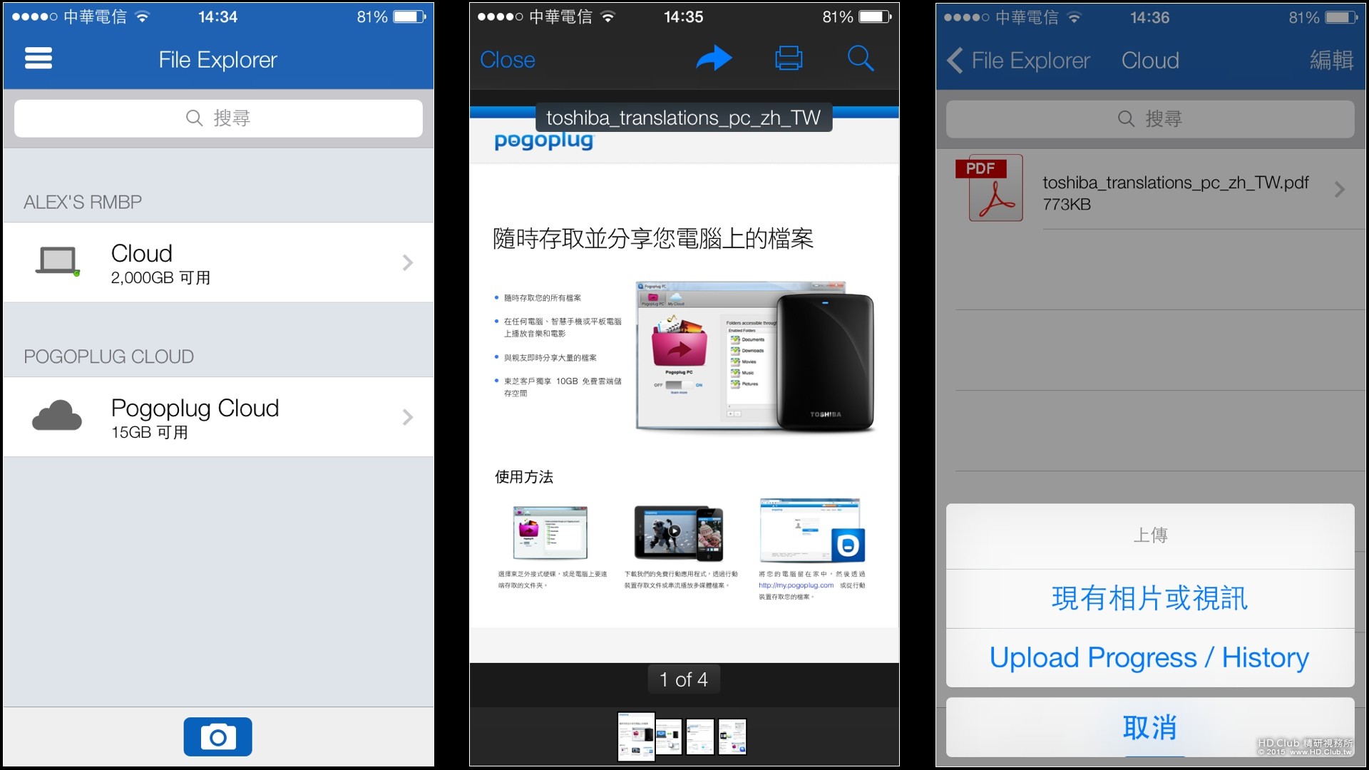 但 TOSHIBA Canvio Connect II 所附贈的 Pogoplug PC 這套軟體,感覺有點類似過去用 VNC 遠端連回電腦那樣的概念。也就是安裝完這套軟體後,在不同的裝置間只要透過專屬 APP 及帳號登入,就能直接從線上存取你遠端電腦中所開放的儲存空間。譬如說當我把這顆 2TB 的行動硬碟連到電腦後,並在電腦上安裝好 Pogoplug PC 這套應用程式 (有 Windows 跟 Mac 兩個版本),設定好開放存取的權限,接著在手機上也安裝好 Pogoplug 專屬 APP (同樣有分 iOS 及 Android 兩大系統),就能透過申請好的帳號,從遠端進去行動硬碟裡撈取檔案,當然也能反過來把手機上的資料備份回行動硬碟之中。