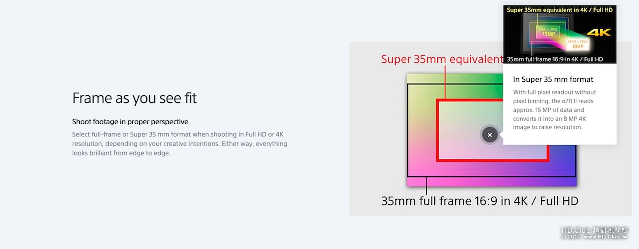 A7R II 能將 Full Frame 感光元件切換成「電影標準」的 Super 35 模式拍攝,除了滿足電影工作者搭配 PL 鏡的使用需求外,像素排列上也「剛好」滿足了 4K 影像「全像素讀取」的需求,因此便能避免像素重取樣時的摩爾紋現象發生。