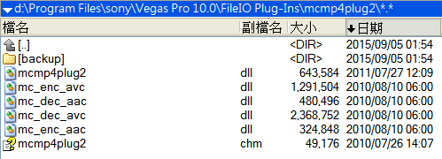 2.把compoundplug目錄下檔案移到自建的backup目錄裡,重開vegas會用mcmp4plug2.dll讀入檔案: