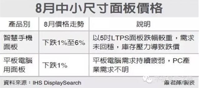 IHS 指出,例如8 月的智能手機面板價格持續下跌1% 至6% ,除了供給面的殺價壓力之外,智能手機面板的需求也沒有反彈,目前品牌廠對景氣仍保守,而且在庫存偏高之下,這對價格形成壓力,預期第3 季不論是任何一種面板尺寸,都將面臨價格壓力,並侵蝕到面板廠的獲利。