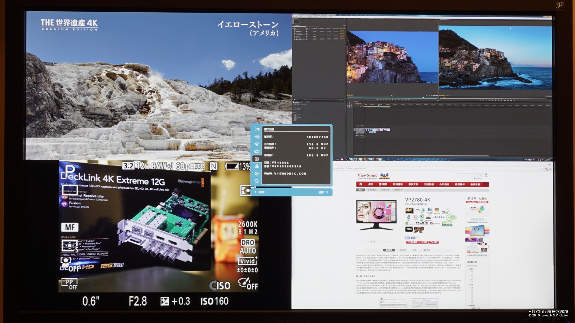 由於 VP2780-4K 的 HDMI 符合 2.0 標準,能輸入 4K/60P 的訊號。而站長剪輯用的工作站正好裝了支援 HDMI 2.0 的 Blackmagic-Design DeckLink 4K Extreme 12G 介面卡,此時用 Adobe Premiere CC 開啟了 4K 專案,便能在 VP2780-4K 上看到原生 4K/60P 的畫面囉。 (爽度破表)